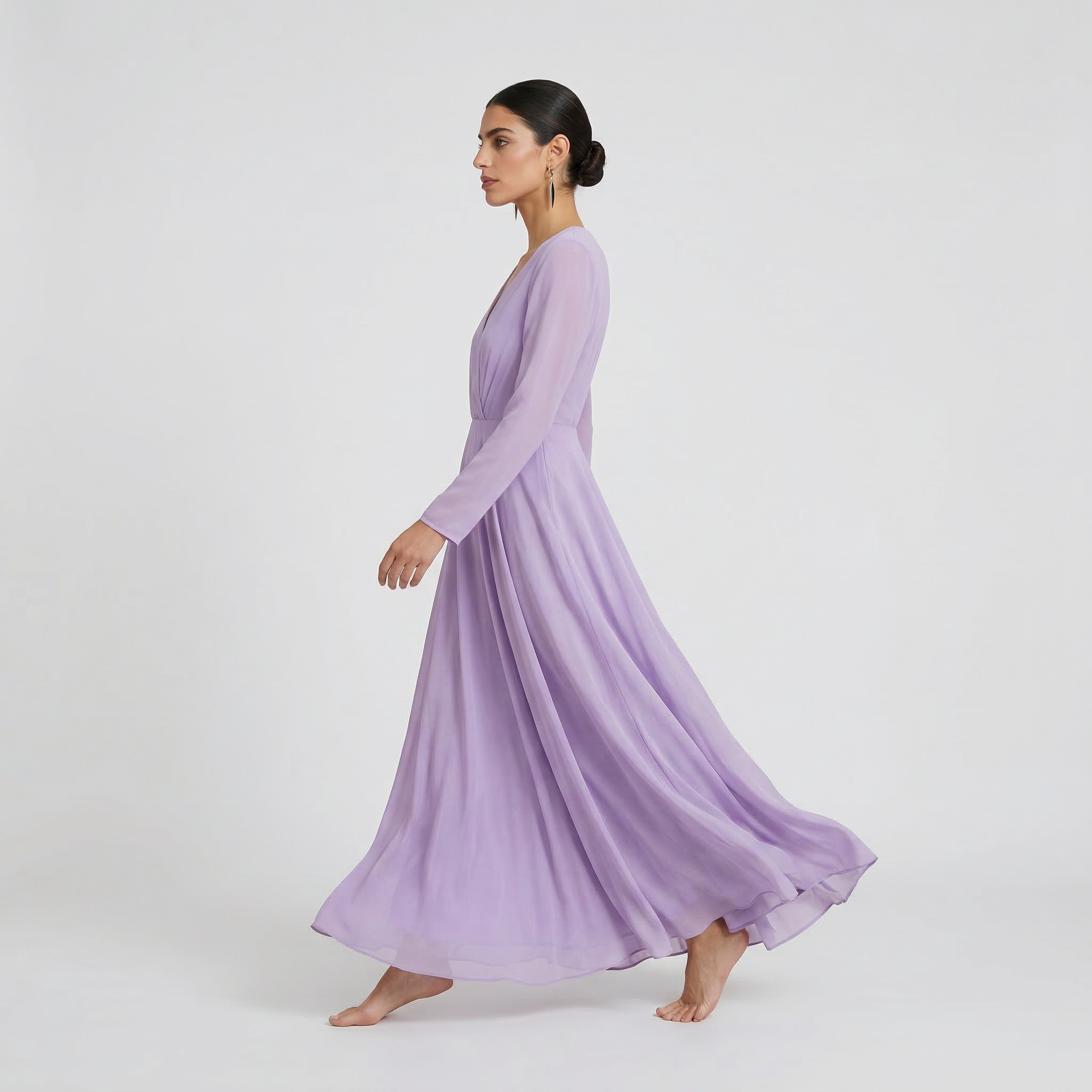 Embrace an aura of gentle elegance with our Lavender Mist Maxi Gown. This piece features a delicate lilac hue that radiates serenity and romantic charm. Designed with sophisticated long sleeves and a fluid, sweeping skirt, it provides a graceful silhouette that is perfect for formal occasions requiring a modest yet ethereal aesthetic.