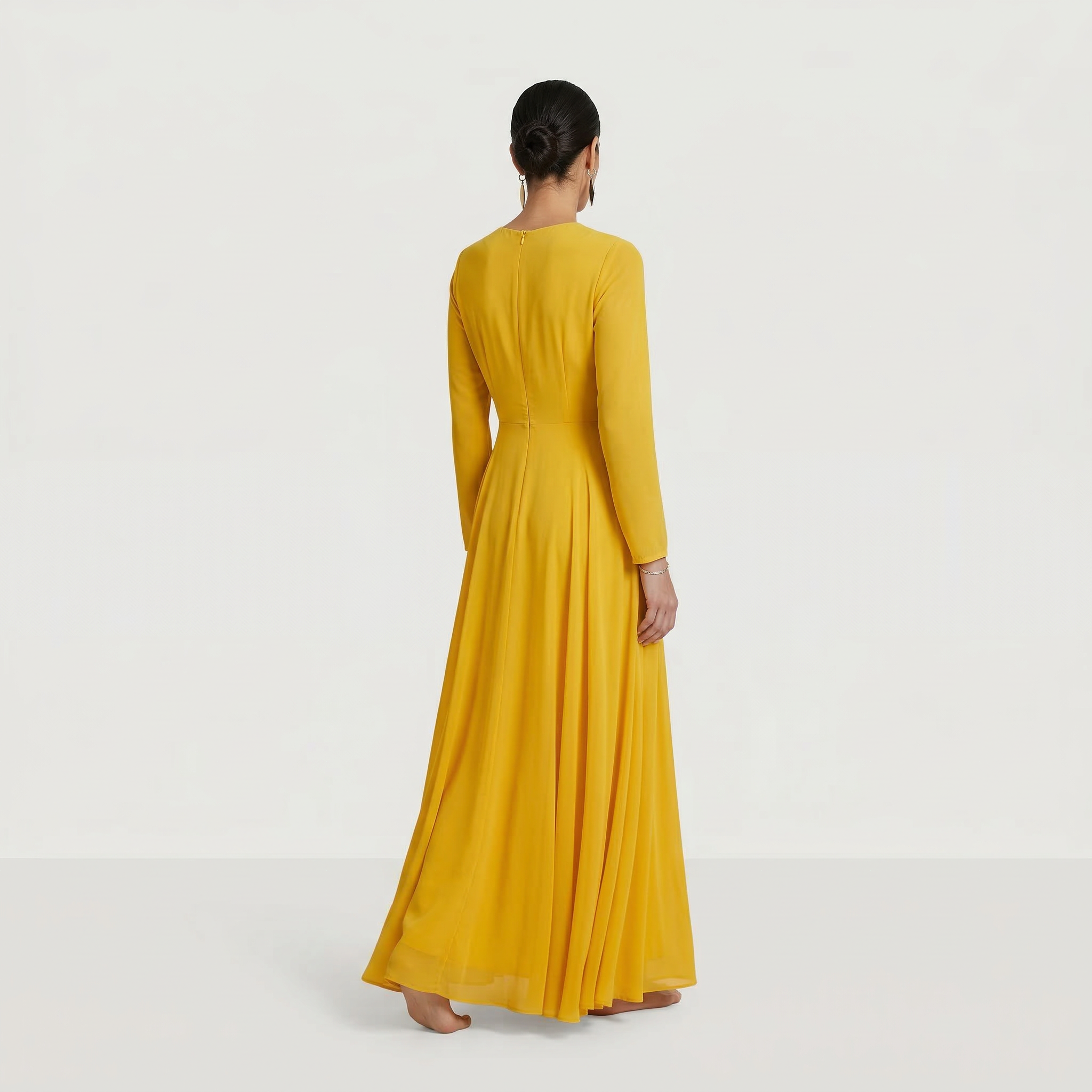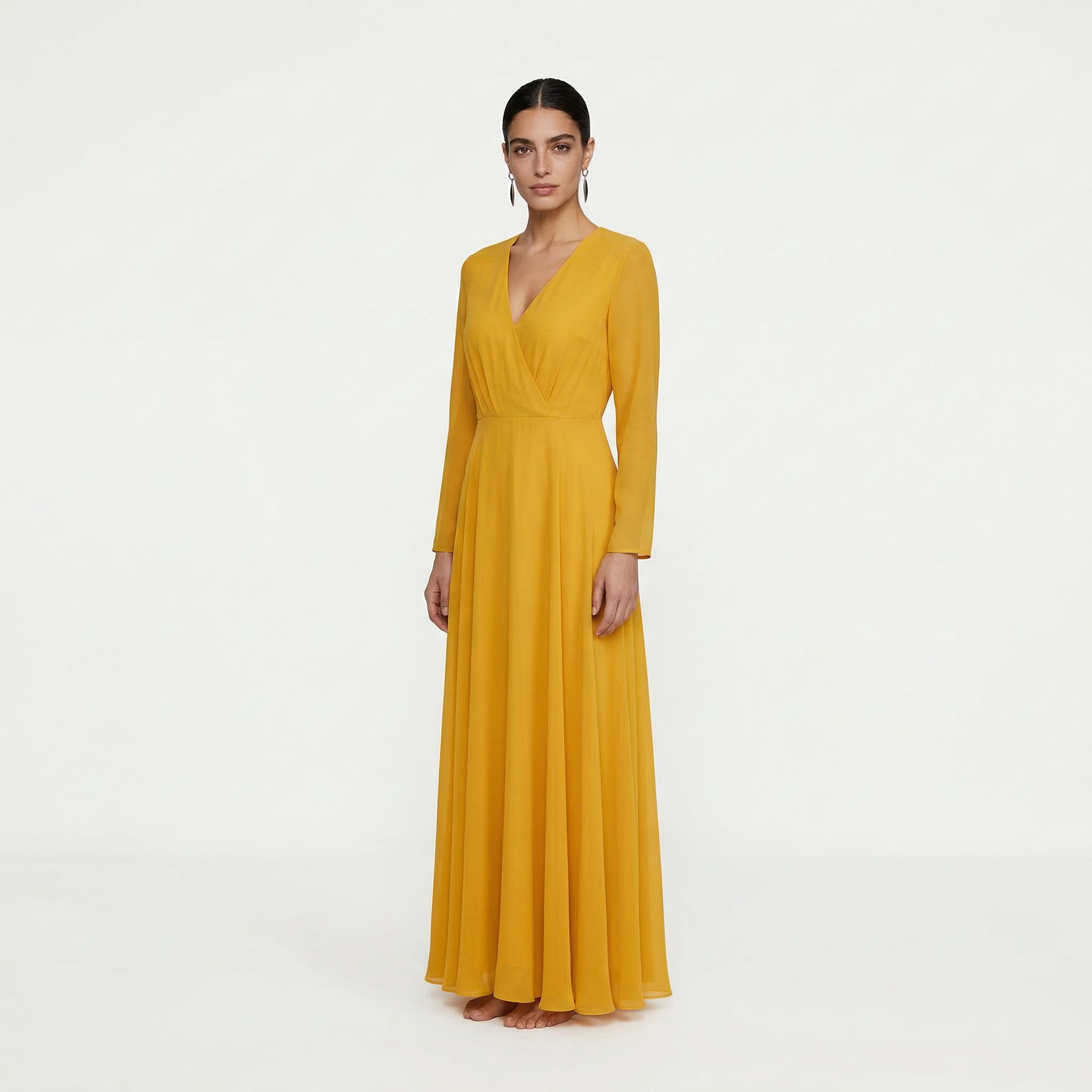 Experience the warmth and elegance of our Golden Ochre Maxi Gown. This piece features a rich, mustard-toned hue that offers a radiant yet grounded look. Designed with modest long sleeves and a classic wrap-style bodice, it provides a dignified and stunning silhouette perfect for high-profile formal receptions, autumn weddings, or sophisticated evening galas.
