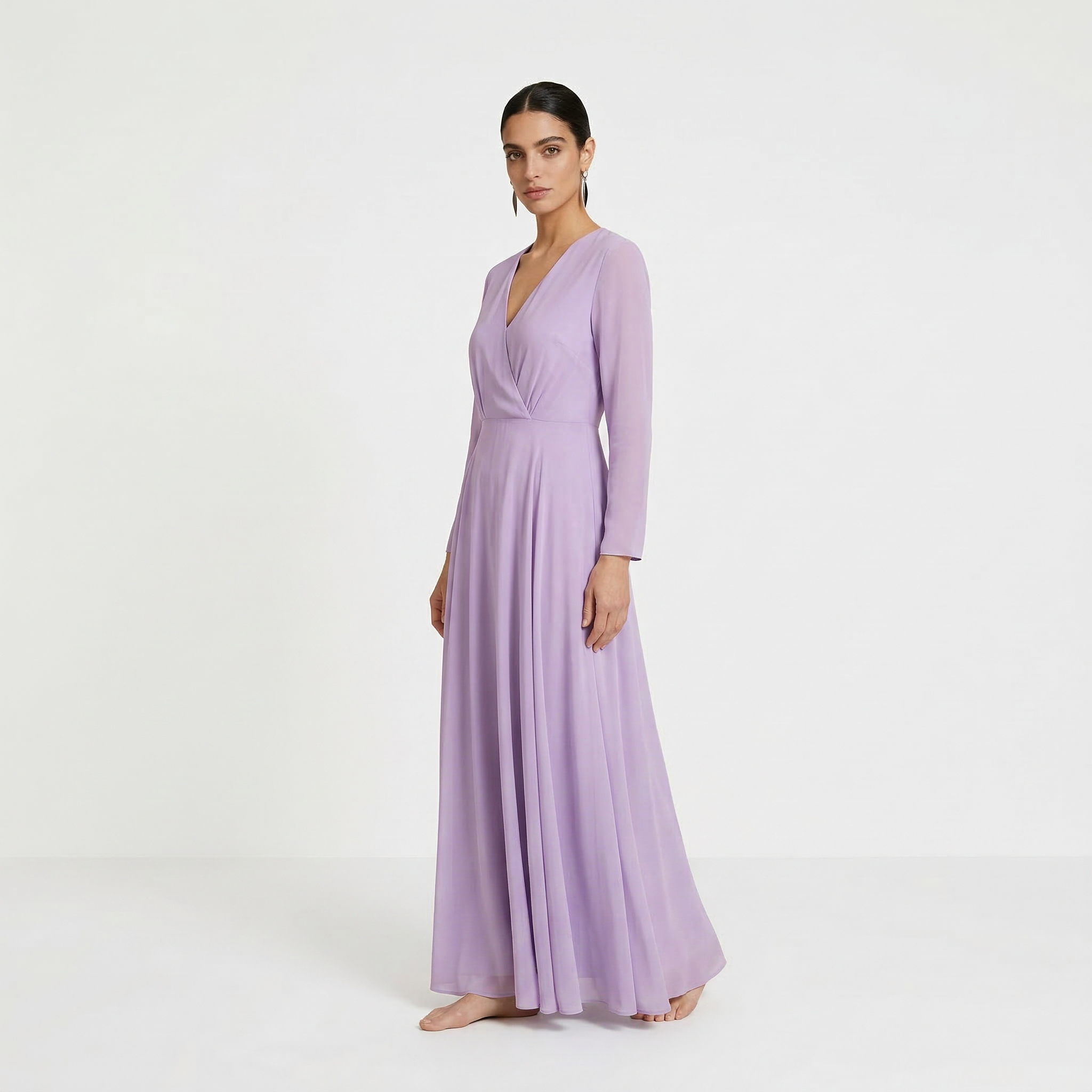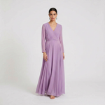 Ethereal Lavender Wrap-Front Maxi Gown - Sophisticated Long-Sleeved Chiffon Dress