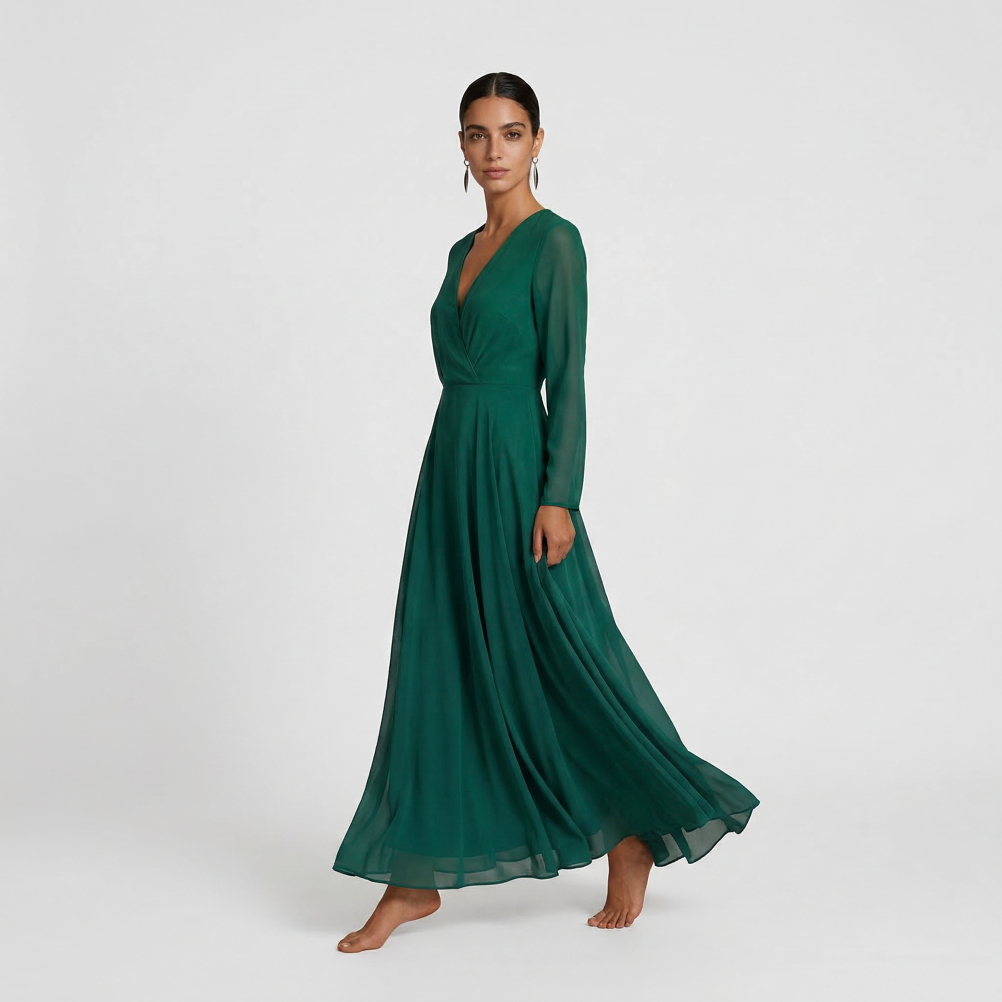 Majestic Emerald Long-Sleeved Gown - Regal Wrap-Front Chiffon Formal Dress