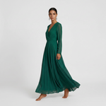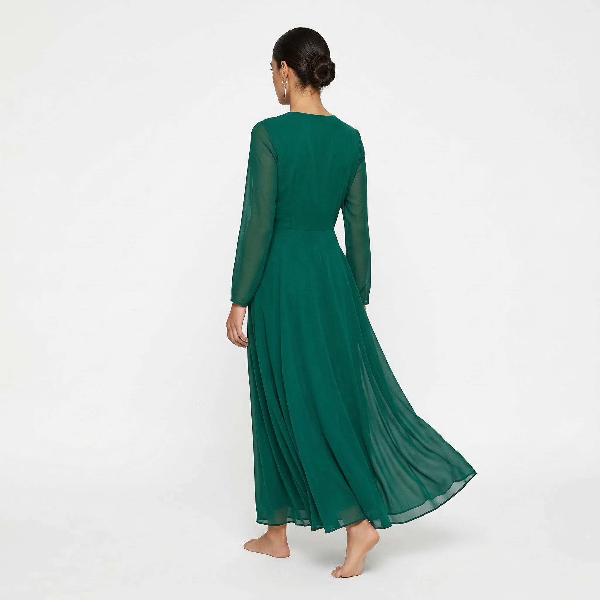 Experience a look of regal sophistication with our Majestic Emerald Gown. This piece features a deep, lush green hue that exudes confidence and timeless charm. Designed with modest long sleeves and a fluid, sweeping skirt, it provides a graceful silhouette that is perfect for prestigious formal occasions, winter galas, and high-profile evening receptions.