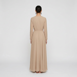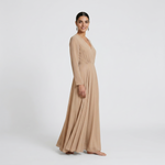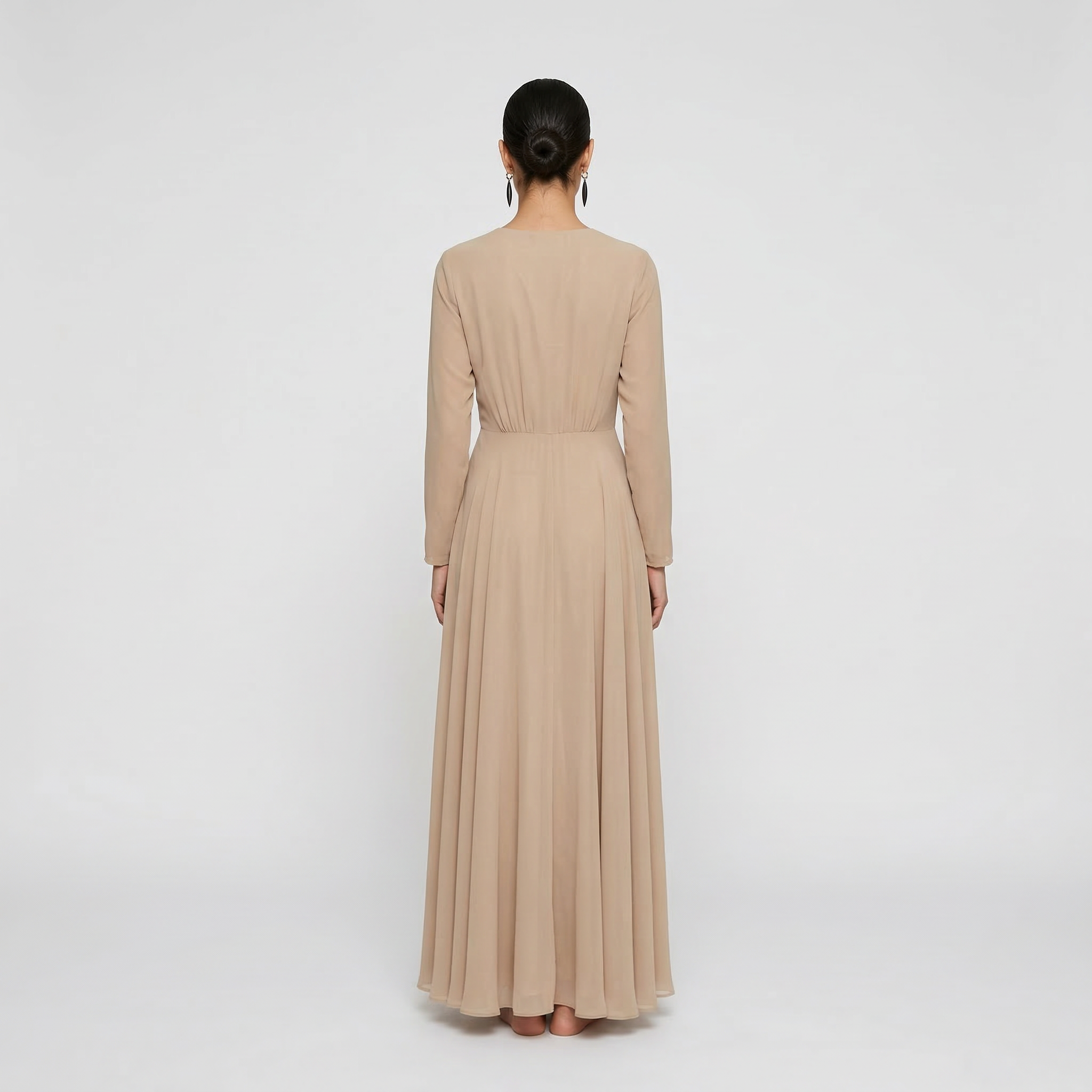 Experience understated luxury with our Timeless Champagne Maxi Gown. This piece is designed for those who appreciate sophisticated modesty and graceful movement. Featuring long, elegant sleeves and a classic wrap-style bodice, the neutral nude tone offers a versatile and refined aesthetic perfect for high-end formal occasions.